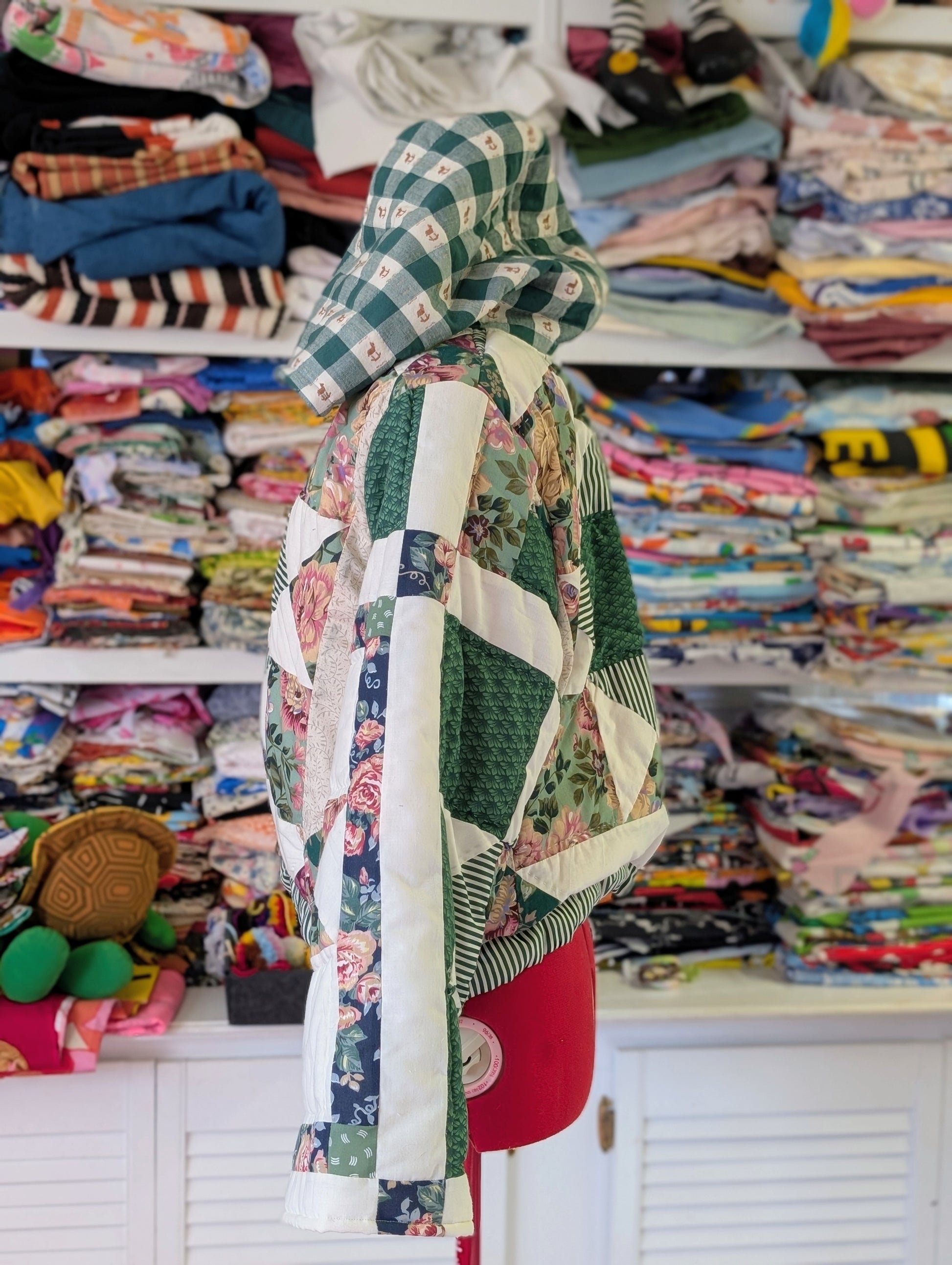 This cutie is upcycled from a vintage comforter.