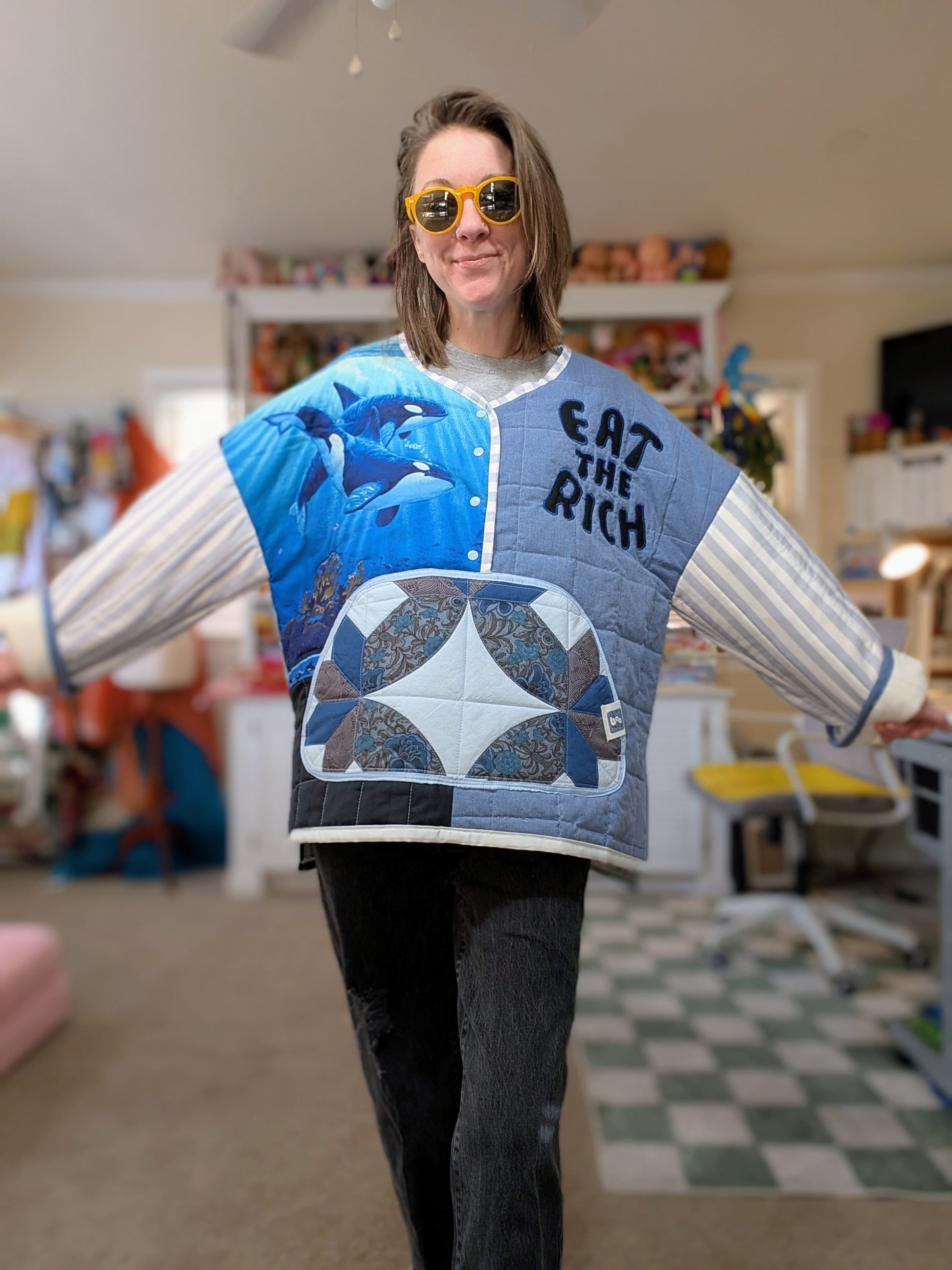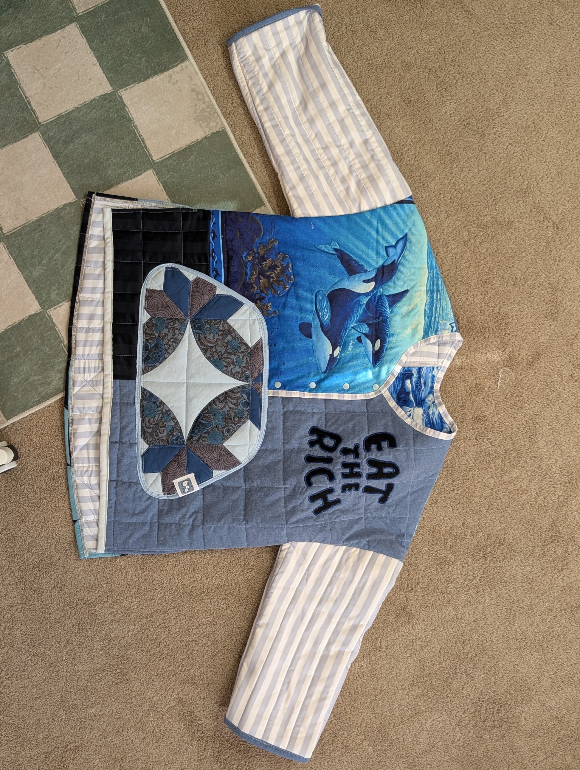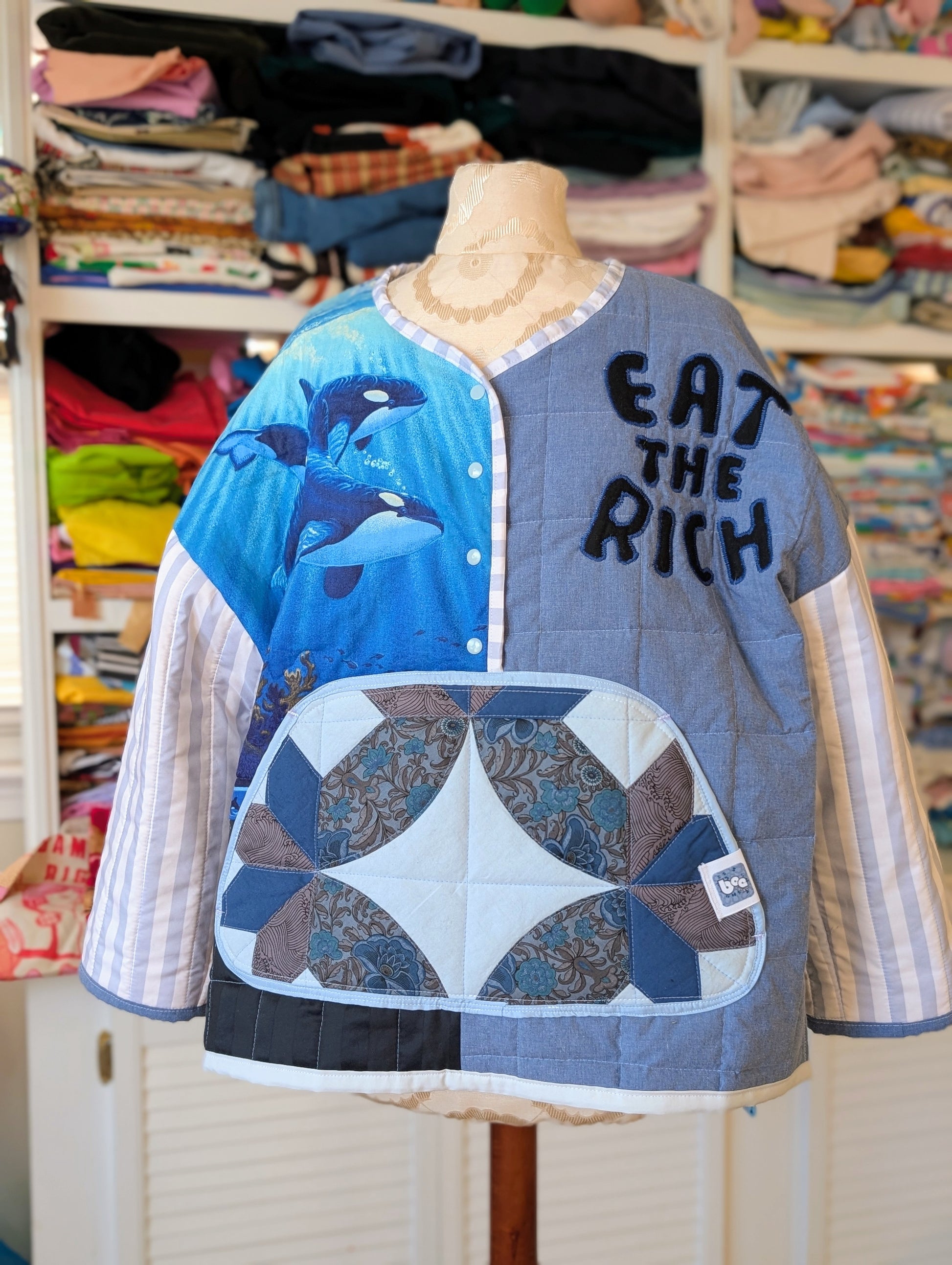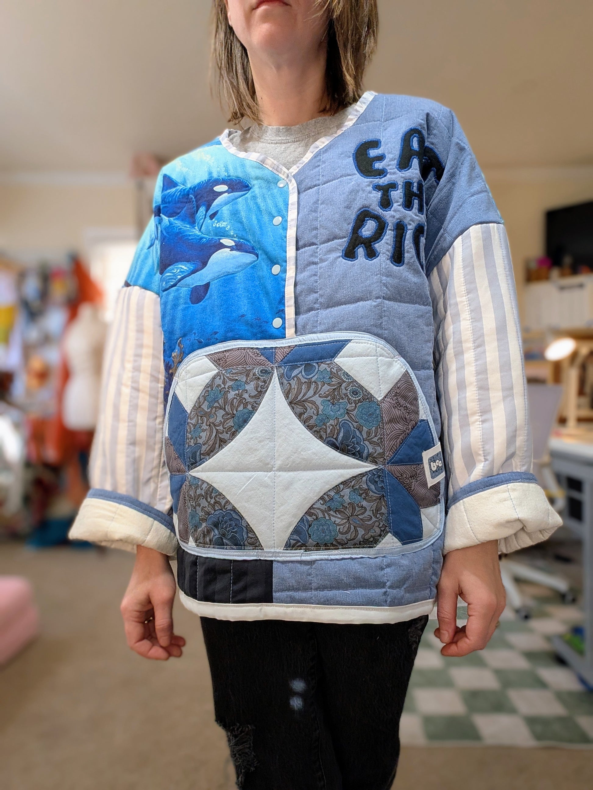 This 'Eat the Rich' Pullover was made with all of the rage and love in my heart and soul. I thrifted all of the fabric that's included in the piece, and handmade all of the letter and orca appliques. This style pullover is my favorite — roomy and boxy. The torso pieces on the front and back are lined with a cotton/polyester blend fabric, and the sleeves and front pocket are lined with fleece. There are four working snaps on the front and 6 inch slits on the side to provide some extra space and movement to the garment. The pullover is fully quilted with a combination of high and low loft batting to keep you nice and warm.