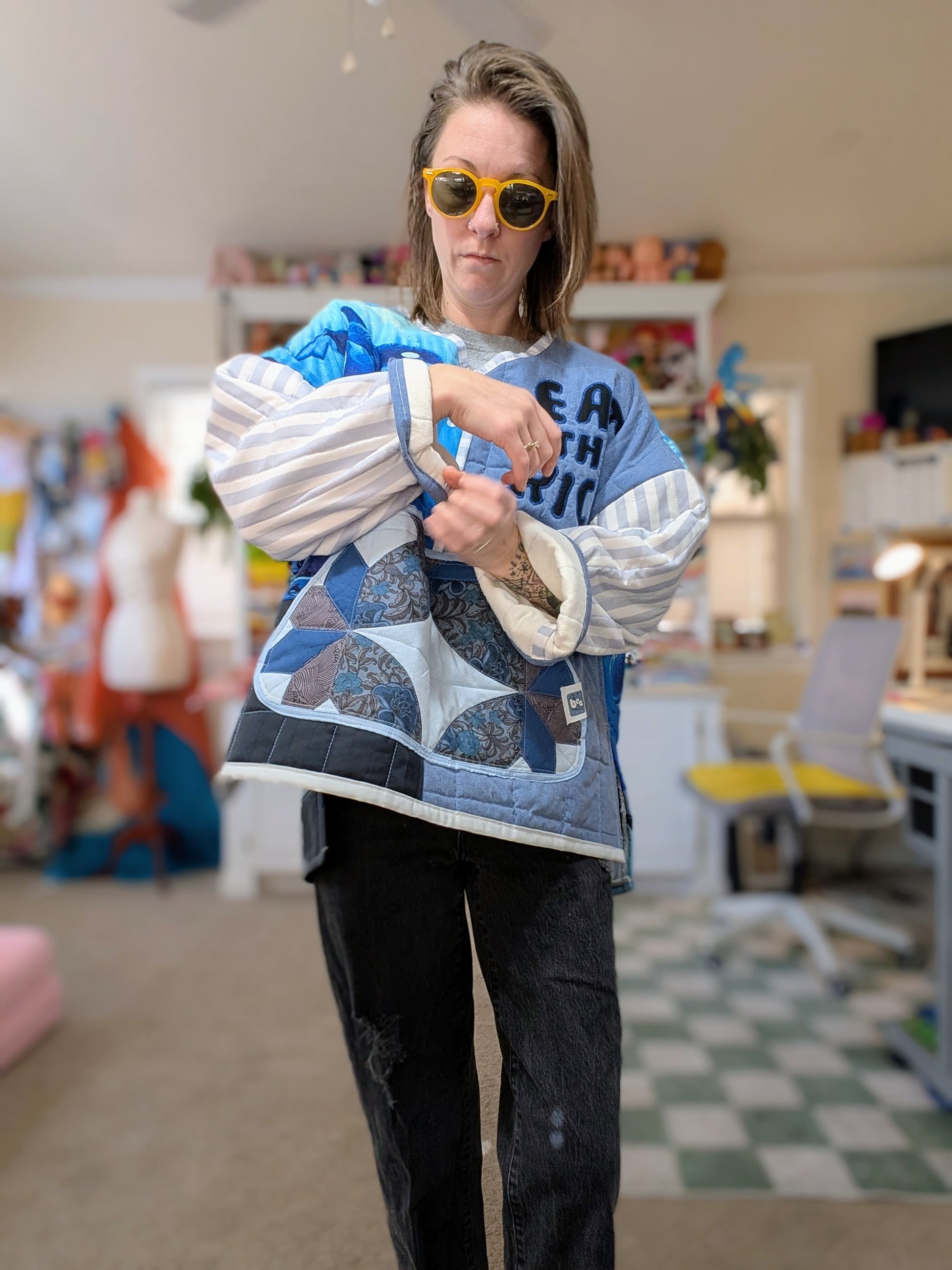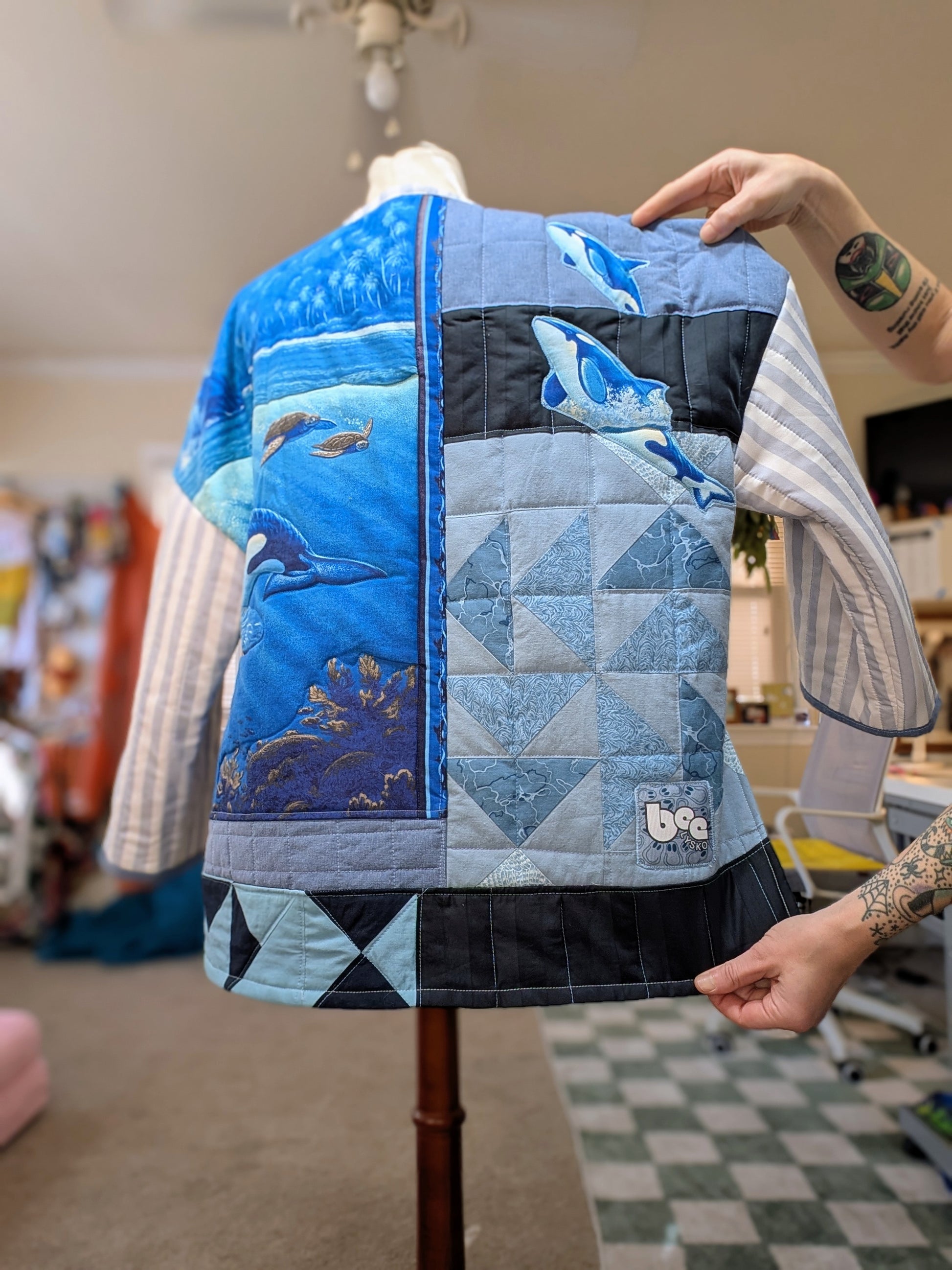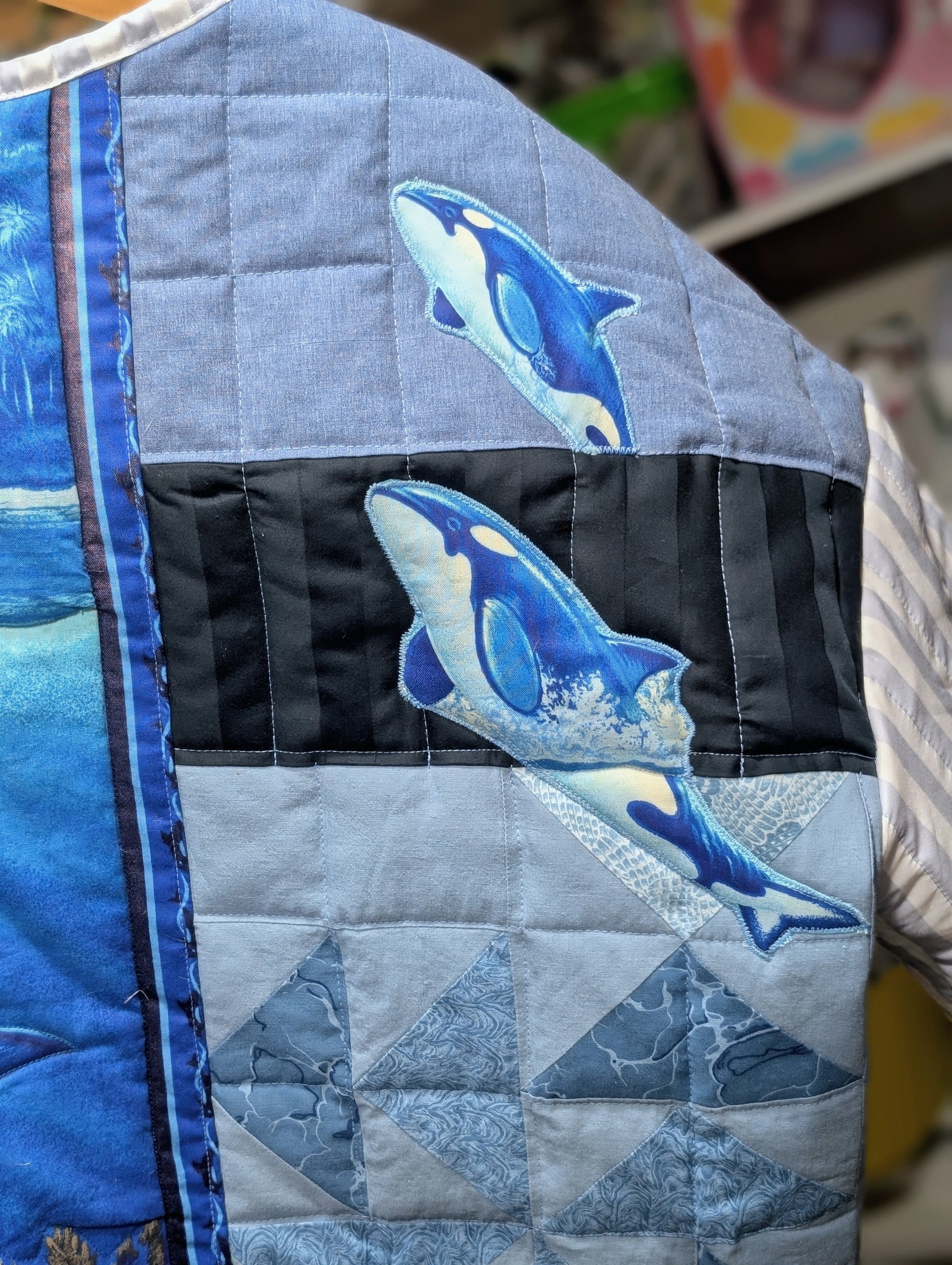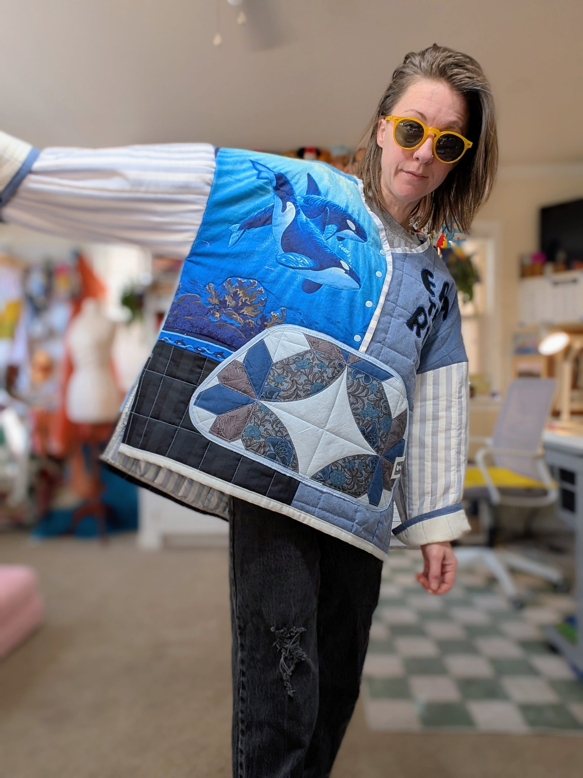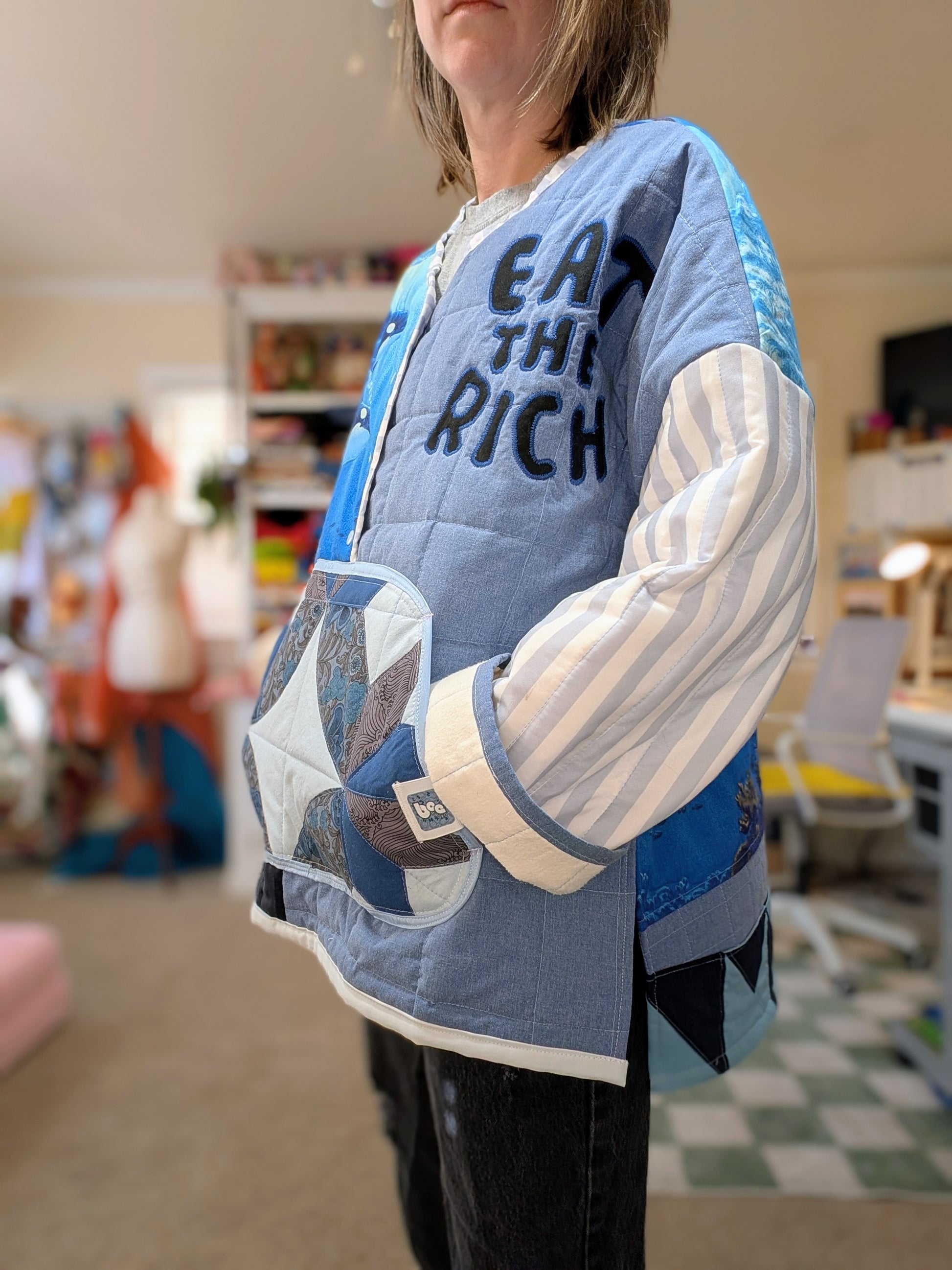 This 'Eat the Rich' Pullover was made with all of the rage and love in my heart and soul. I thrifted all of the fabric that's included in the piece, and handmade all of the letter and orca appliques. This style pullover is my favorite — roomy and boxy. The torso pieces on the front and back are lined with a cotton/polyester blend fabric, and the sleeves and front pocket are lined with fleece. There are four working snaps on the front and 6 inch slits on the side to provide some extra space and movement to the garment. The pullover is fully quilted with a combination of high and low loft batting to keep you nice and warm.