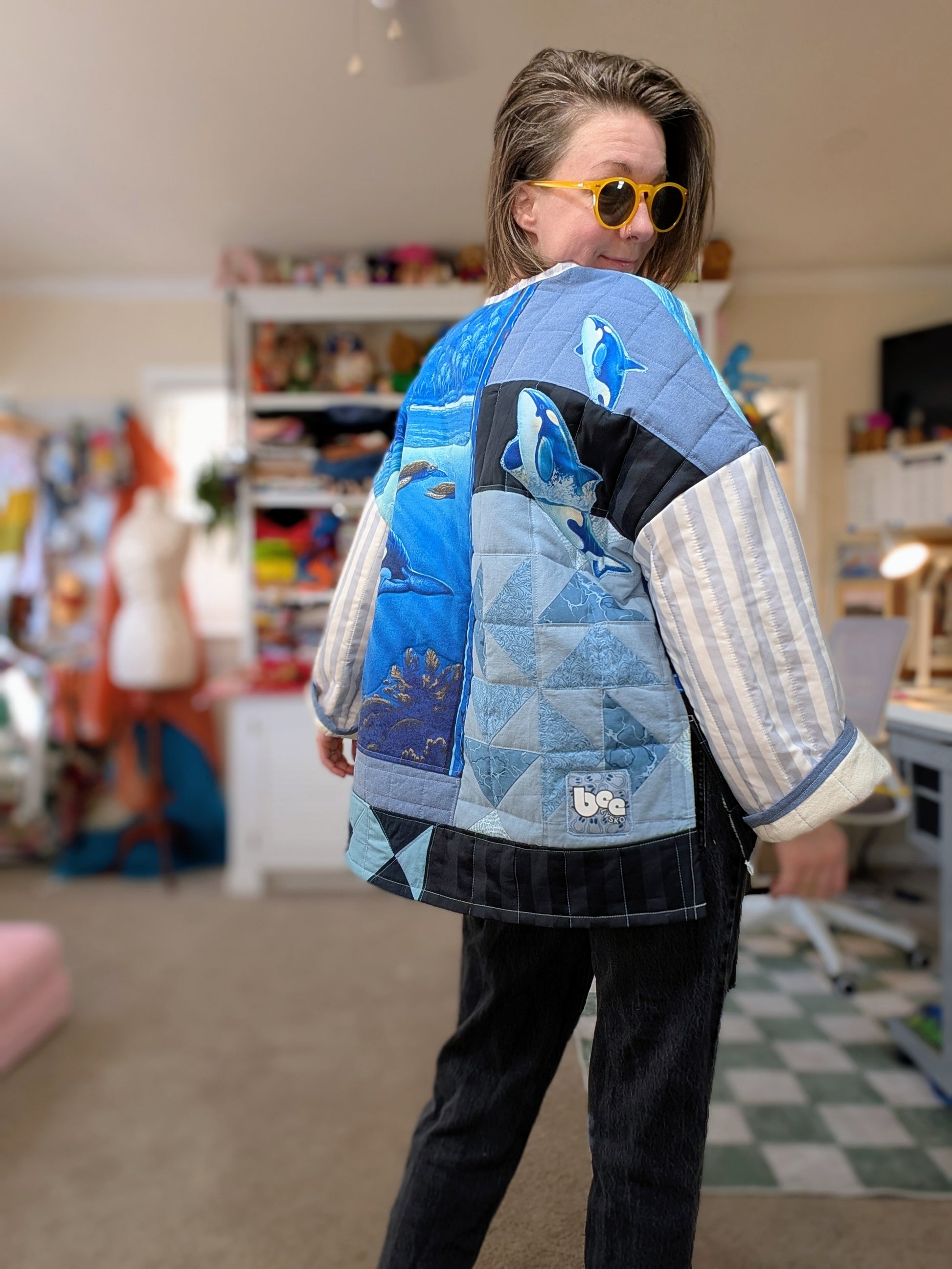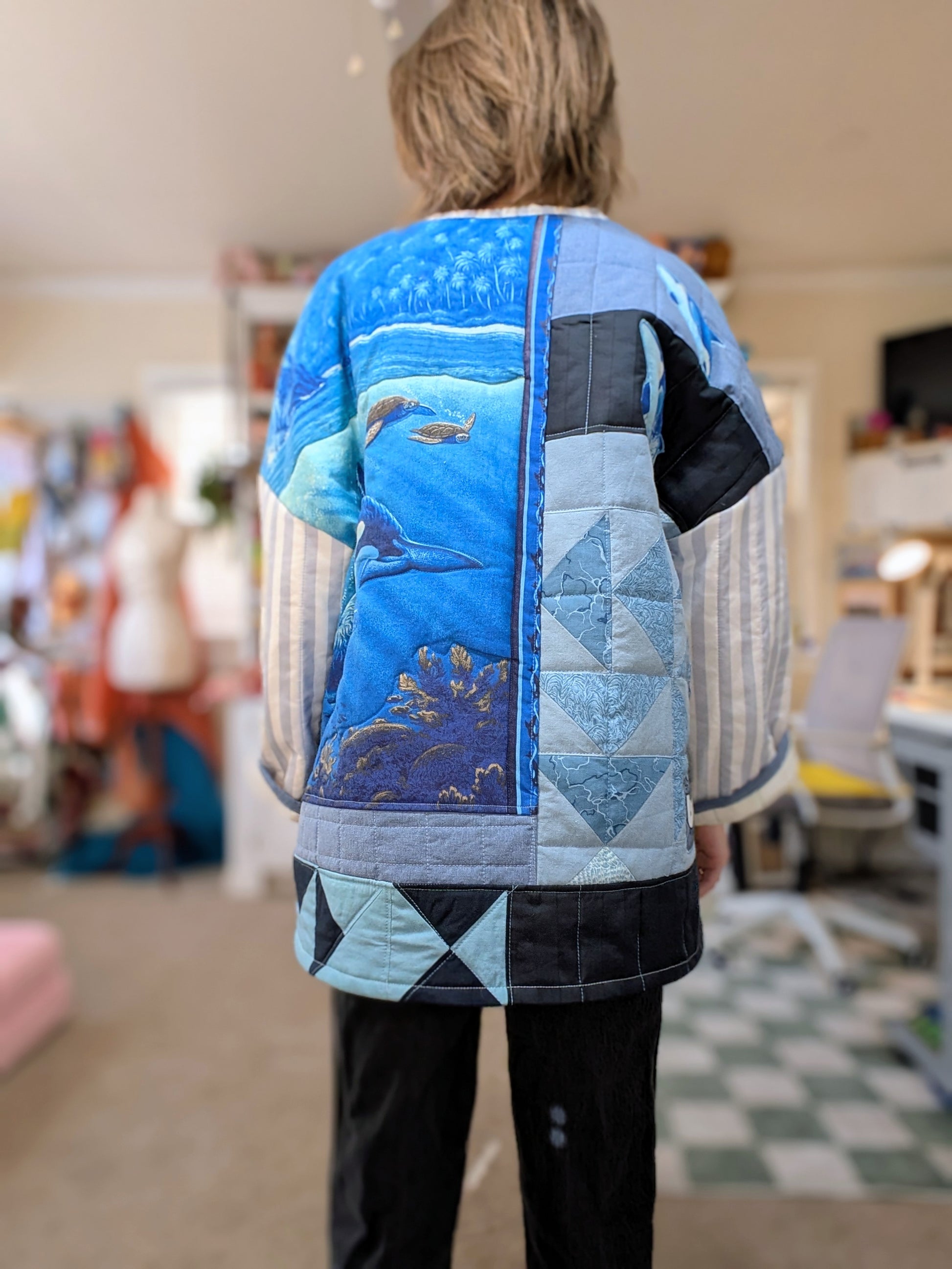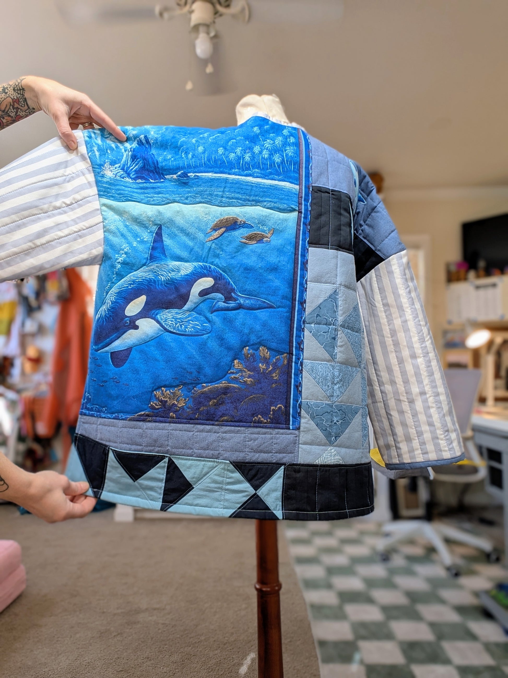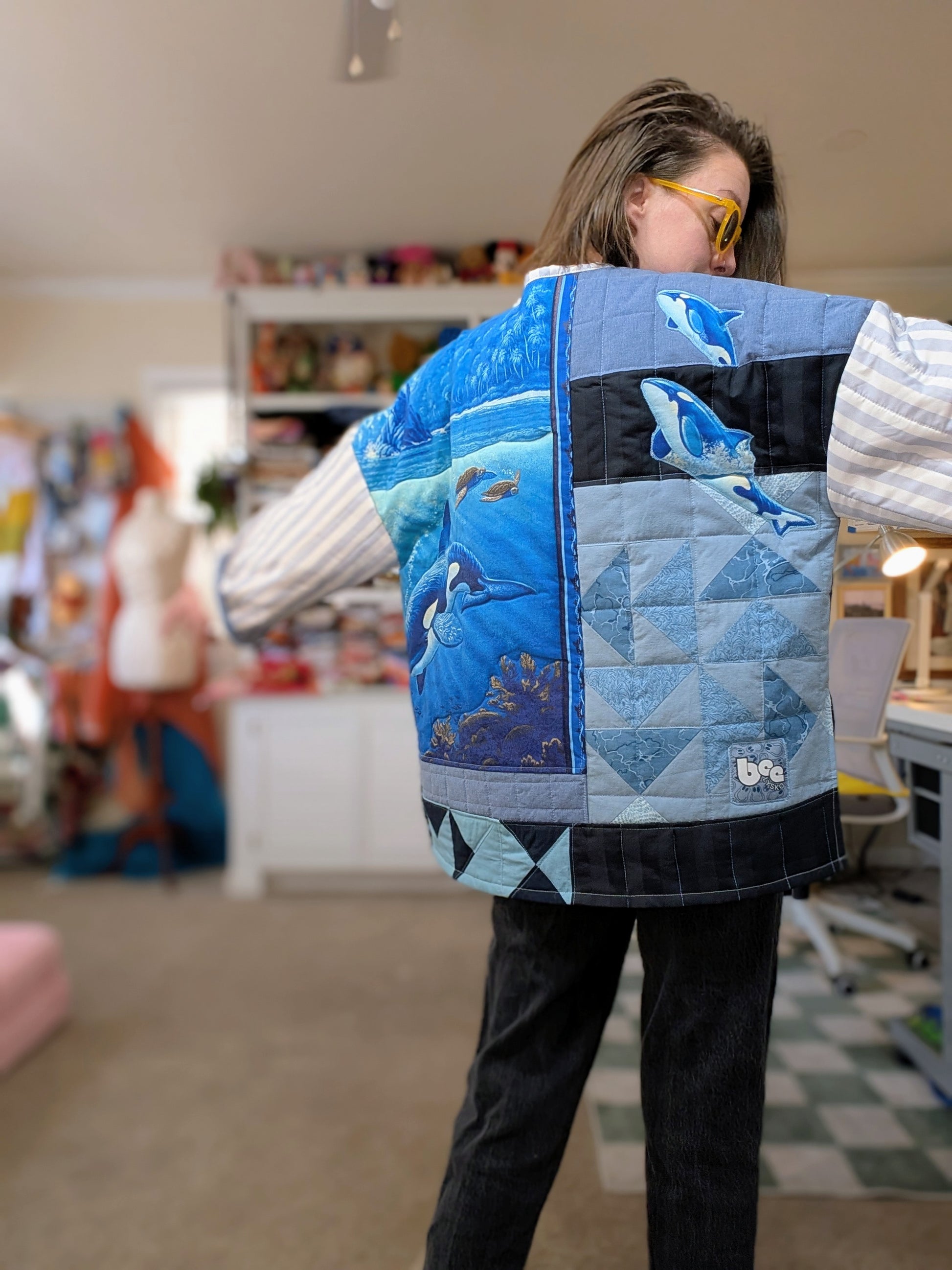 This 'Eat the Rich' Pullover was made with all of the rage and love in my heart and soul. I thrifted all of the fabric that's included in the piece, and handmade all of the letter and orca appliques. This style pullover is my favorite — roomy and boxy. The torso pieces on the front and back are lined with a cotton/polyester blend fabric, and the sleeves and front pocket are lined with fleece. There are four working snaps on the front and 6 inch slits on the side to provide some extra space and movement to the garment. The pullover is fully quilted with a combination of high and low loft batting to keep you nice and warm.